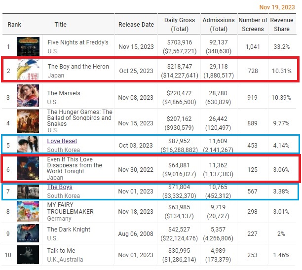 ところが、韓国では、昨年公開されて100万人以上集客のあった「今夜、世界からこの恋が消えても」が、再上映されていたり、「すずめの戸締り」のヒットを受けて「君の名は。」や「天気の子」が再上映されていたりする。日本実写映画の再上映が、数ある韓国新作映画の公開を押しのけて、6位にまで入ってしまうのだから、これはもう呆れるしかない。