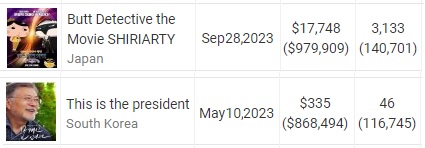 今年に入って、韓国映画館の週末興行成績1位を日本映画が12回も取っている、なんてことも簡単に判る。(国別週間1位は、Mojo でも判るが、データ漏れがあるのが難点)