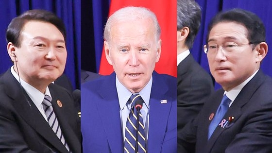 韓国の尹錫悦(ユン・ソクヨル)大統領と岸田文雄首相、米国のバイデン大統領はこの日午後、APEC首脳会議場であるモスコーニ・センターで会って3国の国旗を背景に記念撮影を行った後、直ちに会談場に入った。