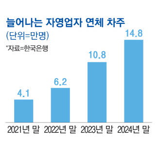 27日、韓国銀行によると、自営業者のうち1ヵ月以上元利金を返済できずにいる延滞借主は、2021年末4万1000人から2024年末14万8000人へと、3年間で3.6倍急増した。