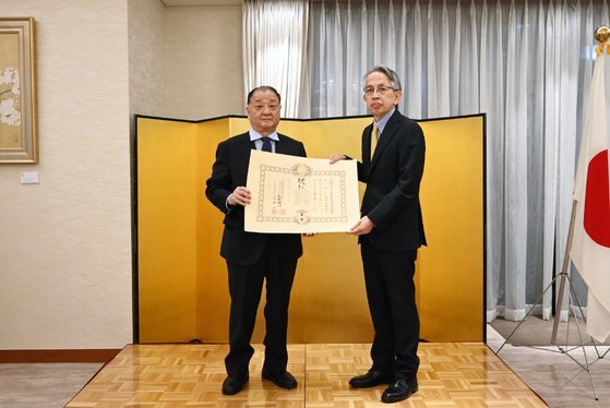 元駐日韓国大使の姜昌一(カン・チャンイル)氏は22日、徳仁天皇が授与する旭日大綬章を受け取った。韓日議員連盟会長や駐日大使を歴任して韓日友好協力増進のために尽くしてきた功績が認められた。大綬章は国や公共分野で功績を挙げた人に授与される旭日章のうち、最高等級の勲章だ。大綬章の授与は相星孝一駐韓日本大使が代理で行った。