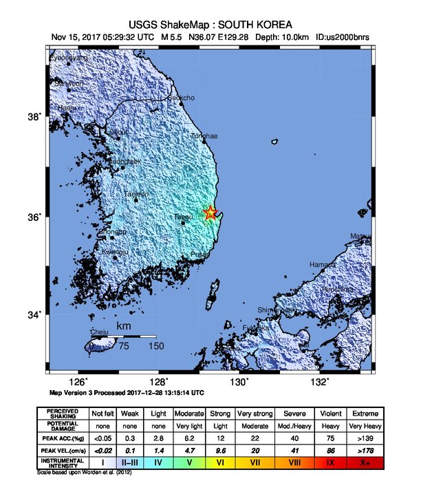 過去の韓国のニュースなどを調べてもM5.8はもっと過去の地震で、浦項の地震は2番目の規模の5.4となっている。