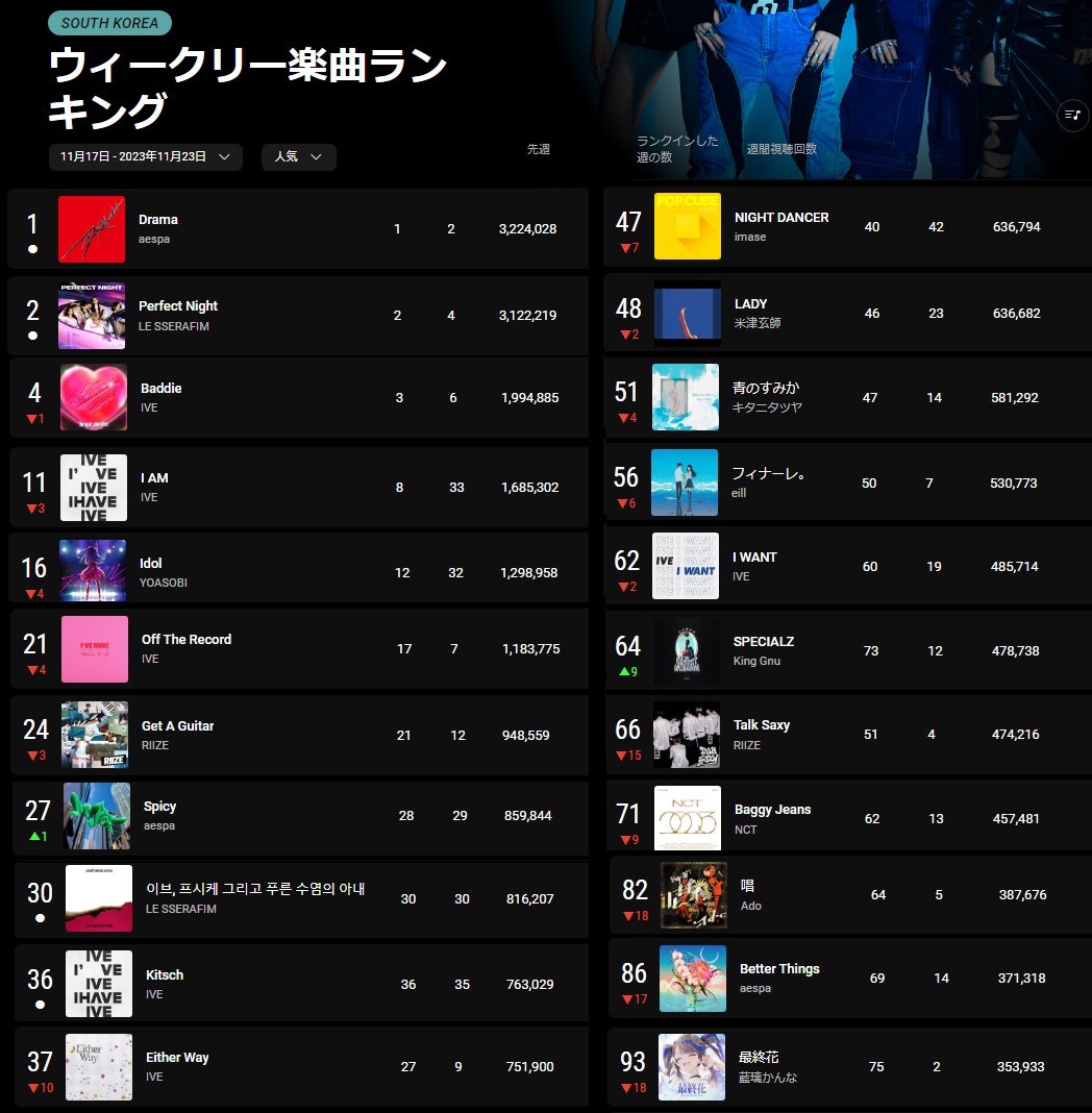 事務所が業者を使って再生させているのか、実際にファンが再生させているのか知らないけど、日本人アーティストと日本人メンバーのいるグループだけでこんなに韓国のランキングに入ってくる。