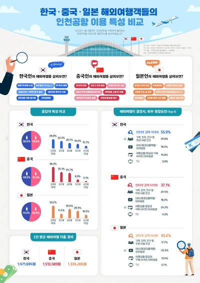 韓国人と中国人は若い人が仁川空港をよく利用した半面、日本人は40-50代の女性の利用が多かった。韓国人は51.1%、中国人は63.3%が20・30代であるのに対し、日本人は40-50代の女性が全体の46.5%を占めた。