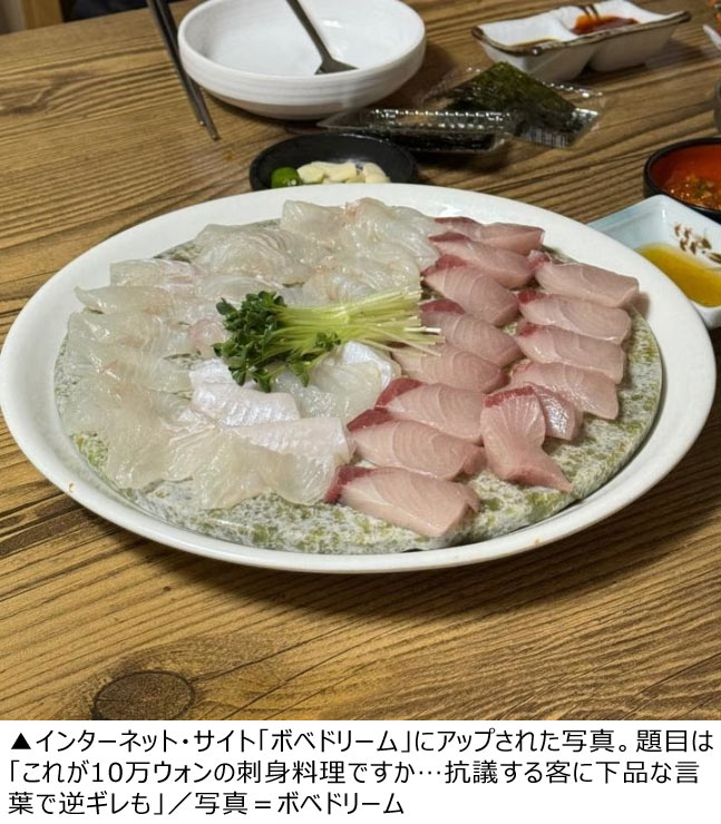 オンライン掲示板「ボベドリーム」に2日「これが10万ウォンの刺し身料理ですか…抗議する客に下品な言葉で逆切れも」という題目の書き込みが写真と共に掲載された。スレ主は「昨日飲み会の2次会で行った刺し身店で出た料理」として1枚の写真をアップした。
