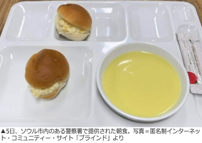 これは、働く人々のための匿名制インターネット・コミュニティー・サイト「ブラインド」に同日、「ソウル○○警察署の朝食メニューです」というタイトルで掲載された写真だ。投稿者は「価格は5000ウォン(約560円)、これで全部。皆さん、朝食を食べて頑張ってください」と書いている。写真に写っている投稿者の向かい側に座っている人物のトレーにも同じパンとジャム、スープがあった。
