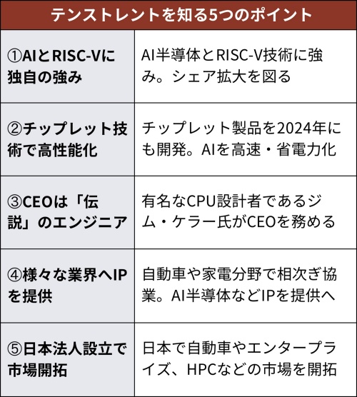 テンストレントはRISC-VプロセッサーやAI処理チップの開発に強みを持つ会社だ。米Advanced Micro Devices(アドバンスト・マイクロ・デバイセズ、AMD)や米Apple(アップル)でプロセッサー開発を手掛けた「伝説のエンジニア」とされるJim Keller(ジム・ケラー)氏が最高経営責任者(CEO)を務めることで有名だ。テンストレントはどのような会社なのか、5つのポイントで解説する。>>1