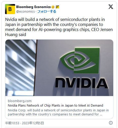 (ブルームバーグ): 米半導体大手エヌビディアのジェンスン・フアン最高経営責任者(CEO)は5日、日本で人工知能(AI)を活用した工場のネットワークを構築する考えを示した。