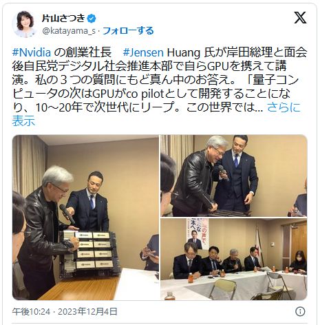政府は生成AIに必要な画像処理半導体(GPU)の供給で同社に協力を働きかけている。4日には岸田文雄首相がファン氏と面会した。西村経産相は日本も生成AIの開発に力を入れており、エヌビディアのGPUが必要で、「連携が欠かせない」と改めて強調した。