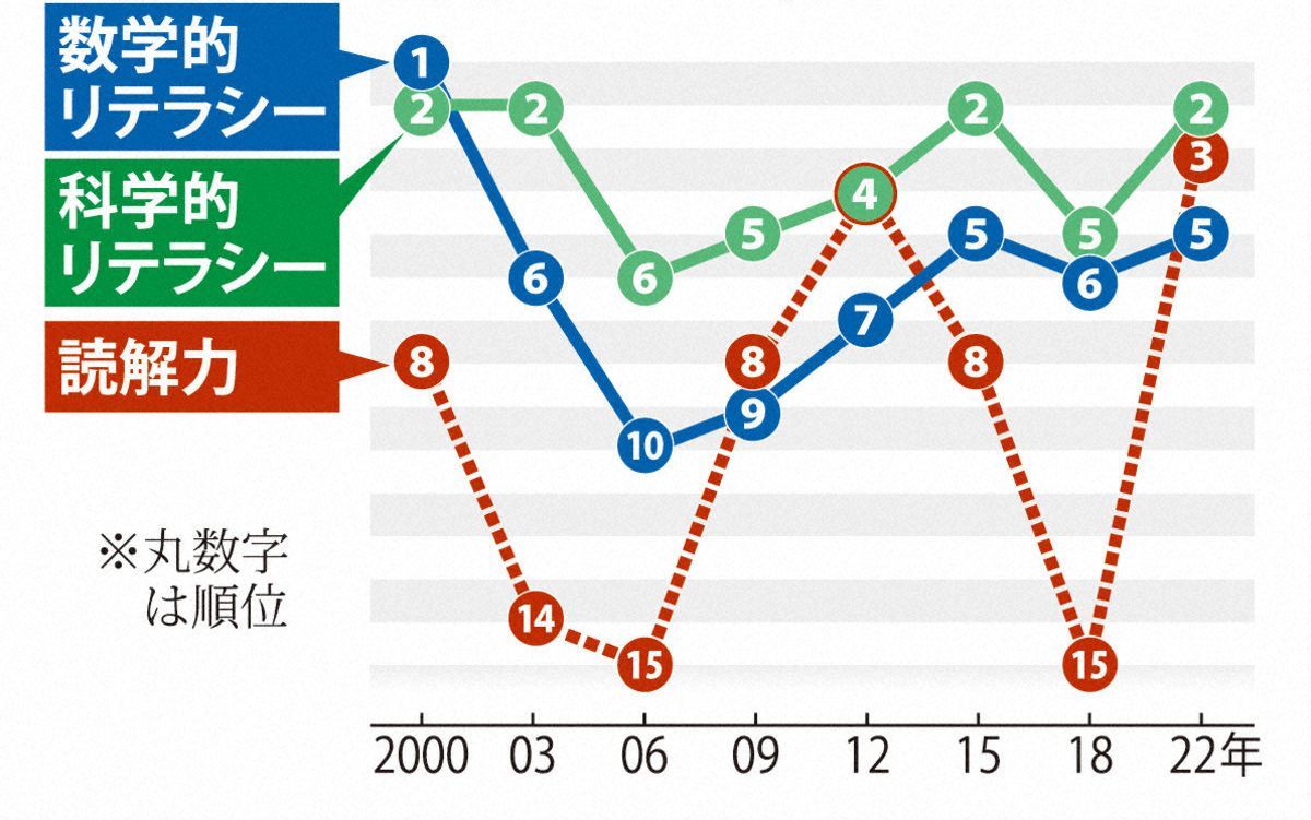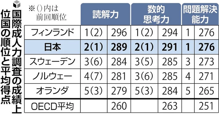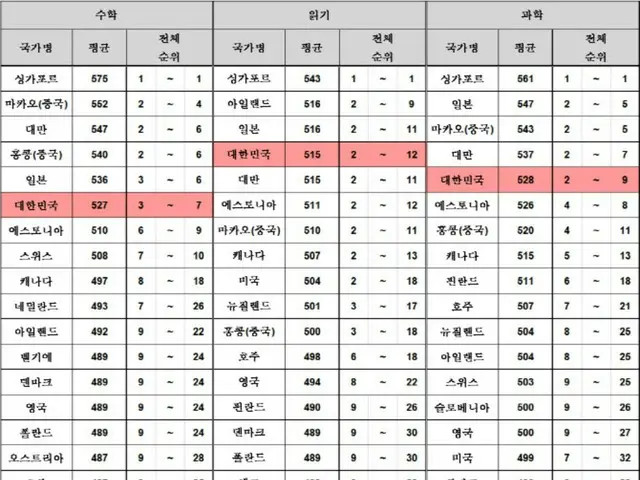 評価の結果、韓国は数学・読解力・科学領域で、すべて日本より低かったことがわかった。 OECD加盟国だけの評価で、韓国は数学2位(527点)、読解3位(515点)、科学2位(528点)を記録した。一方、日本は数学1位(536点)、読解2位(516点)、科学1位(547点)を占めた。以下リンク先参照乞う