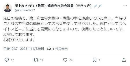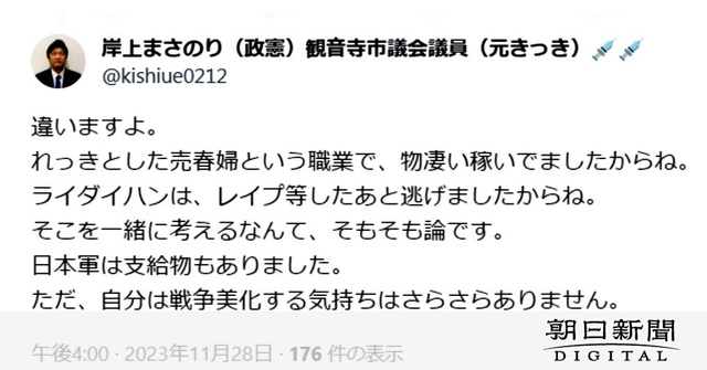 自民党所属の岸上政憲市議は最近、X(旧ツイッター)に韓日歴史問題に関する投稿をし、慰安婦について「売春婦という職業でものすごい稼いでいた」と嘲弄した。韓国に対しては「乞食しか出来ることの無い集団」と表現した。