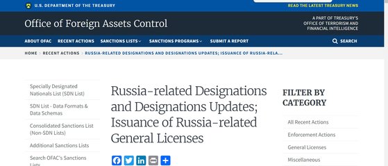 米財務省がロシアの戦争遂行と関連して企業と個人を制裁しながら制裁対象に韓国国籍の人物を含めた。[OFACサイト キャプチャー]