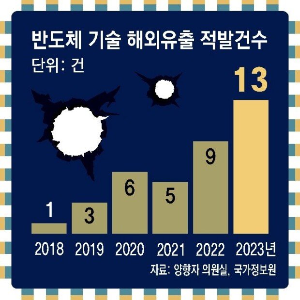 8日、「韓国の希望」の梁香子(ヤン・ヒャンジャ)議員室によると、国家情報院が昨年摘発した半導体技術の海外流出事件は13件で過去最多だった。2022年の9件より44%(4件)増加した。最近、半導体の海外技術流出は16~18年までは毎年1件摘発されたが、19年3件、20年6件など増加傾向にある。世界的に半導体競争が激化し、国内技術に対する海外の政府や企業による奪取の動きが増えたことを受け、韓国の捜査機関が積極的に摘発に乗り出した結果とみられる。