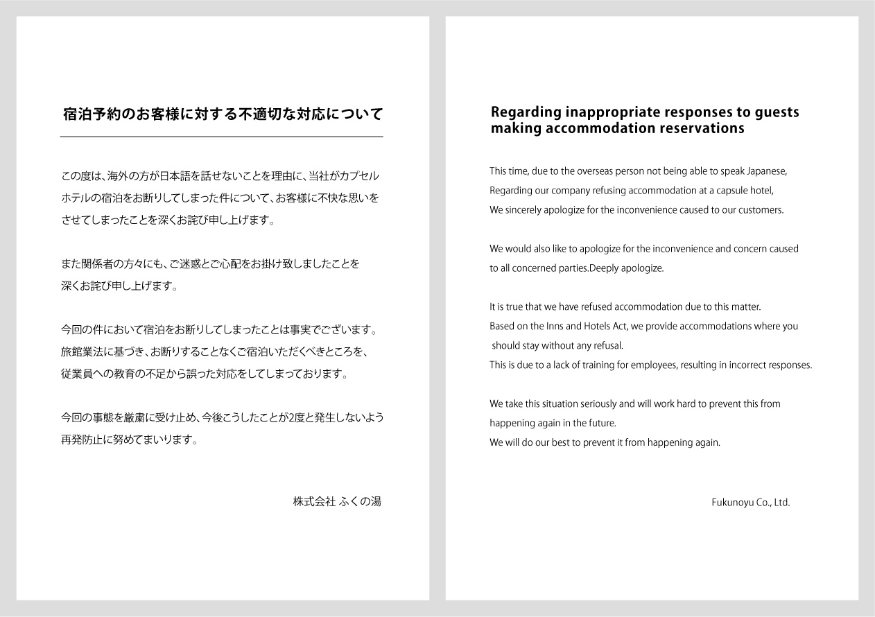 ホテル側は「日本語ができない外国人の宿泊を拒否したことについて、お客様にご迷惑をおかけしたことに心よりお詫び申し上げます」とし、「私たちは断らずに宿泊施設を提供しなければならなかった。従業員の教育が不十分だったために不適切な応対をした」と述べた。