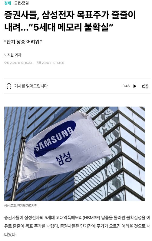 サムスン電子が競合会社のSKハイニックスに比べて人工知能(AI)の核心である広帯域メモリー(HBM)の開発水準が遅れている点も株価を引き下げる要因だ。