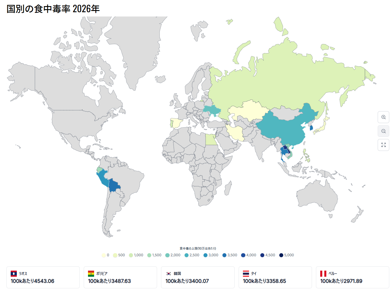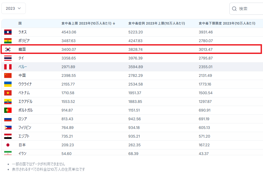 World Population Review などの推計(2026年予測値含む)によると、韓国の人口10万人あたりの食中毒発生率は世界3位らしいぞ w