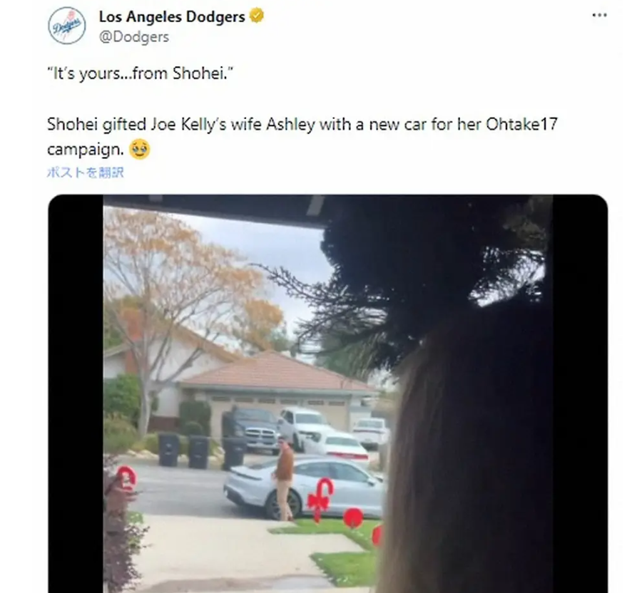これにはドジャース公式X(旧ツイッター)も反応。「“それはあなたのものです…翔平から”。翔平は、ジョー・ケリーの妻アシュリーにOhtake17キャンペーンのために新車をプレゼントしました」と投稿した。