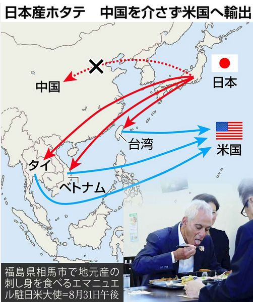 「日本産海産物の全面禁輸という中国の行き過ぎた政治決断とは対照的に、米国は日本とともに立ち向かう」。エマニュエル駐日米大使は8月末に福島県相馬市を訪れ、日本を支持する声明も発表した。