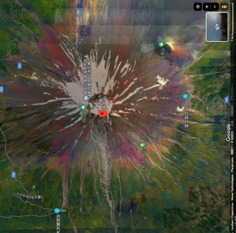 山体の真正面のスジが大沢崩れで、向かって右側の少し黒く凹んでるのが宝永火口。