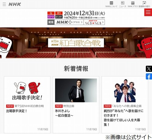 みそかに放送される「第75回NHK紅白歌合戦」の出場歌手が、11月19日に発表された。初出場はNumber_i、こっちのけんと、Creepy Nutsら。事前に報道された通り、旧ジャニーズ勢は“出場なし”となった。放送は12月31日午後7時20分から。司会は有吉弘行、橋本環奈、伊藤沙莉、鈴木奈穂子アナ。