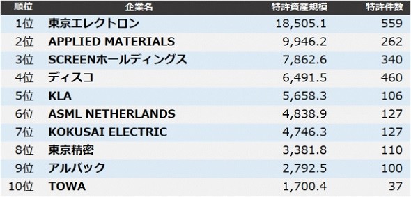 パテント・リザルトは2023年1月17日、半導体製造装置企業が保有する特許資産を総合評価した「半導体製造装置業界 特許資産規模ランキング」を発表した。1位は東京エレクトロン、2位はAPPLIED MATERIALS、3位はSCREENホールディングスとなっている。