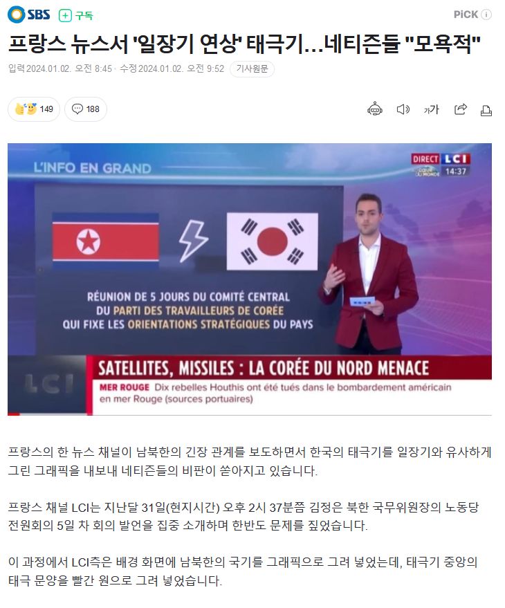 フランスのあるニュースチャンネルが南北朝鮮の緊張関係を報道しつつ、韓国の太極旗を日章旗と同様に描いたグラフィックを出してネチズンたちの批判があふれています。
