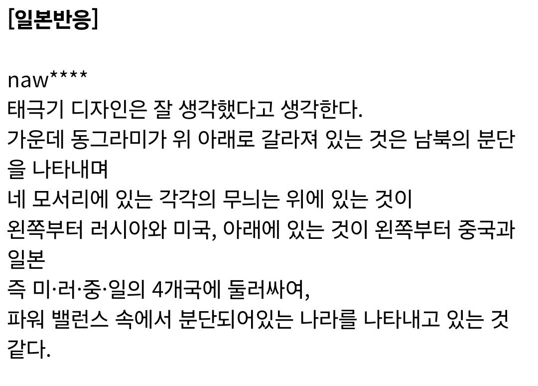 あるネチズンは「韓国の国旗は赤と青が混ざらなければならない」とし「映像の中の国旗は間違って外交的に失礼だ」と批判し、また別の外国ネチズンも「韓国と日本の歴史を知れば大韓民国の国旗をこうして 描いたのは本当に大きな間違いだ」とピンチしました。