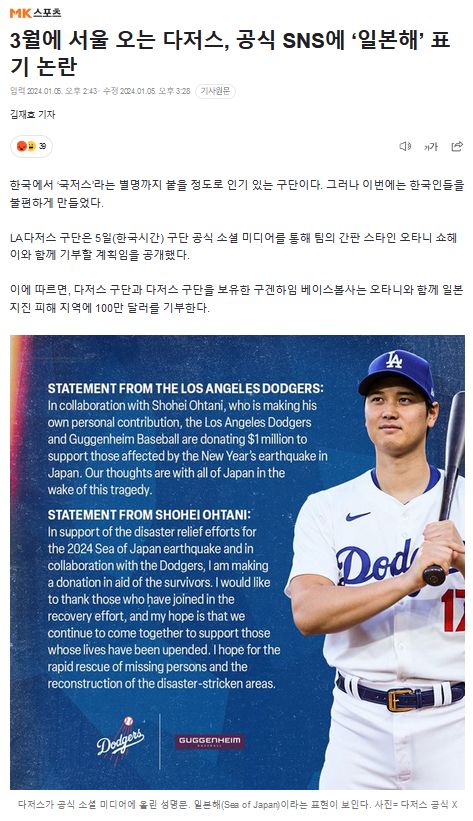 彼らが英文に伝えた大谷のコメントでは「ドジャースと共に2024年“日本海地震”被害復旧の努力を助けるために生存者を助けるための寄付に乗り出すことになった」という文が出てくる。