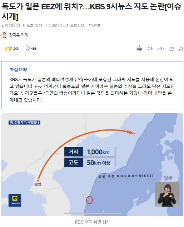 KBSがニュース画面で韓国の独島が日本の排他的経済水域(EEZ)内に含まれるグラフィック地図を使用して物議を醸している。日本の独島領有権主張が入った地図を報道に使用したためだ。