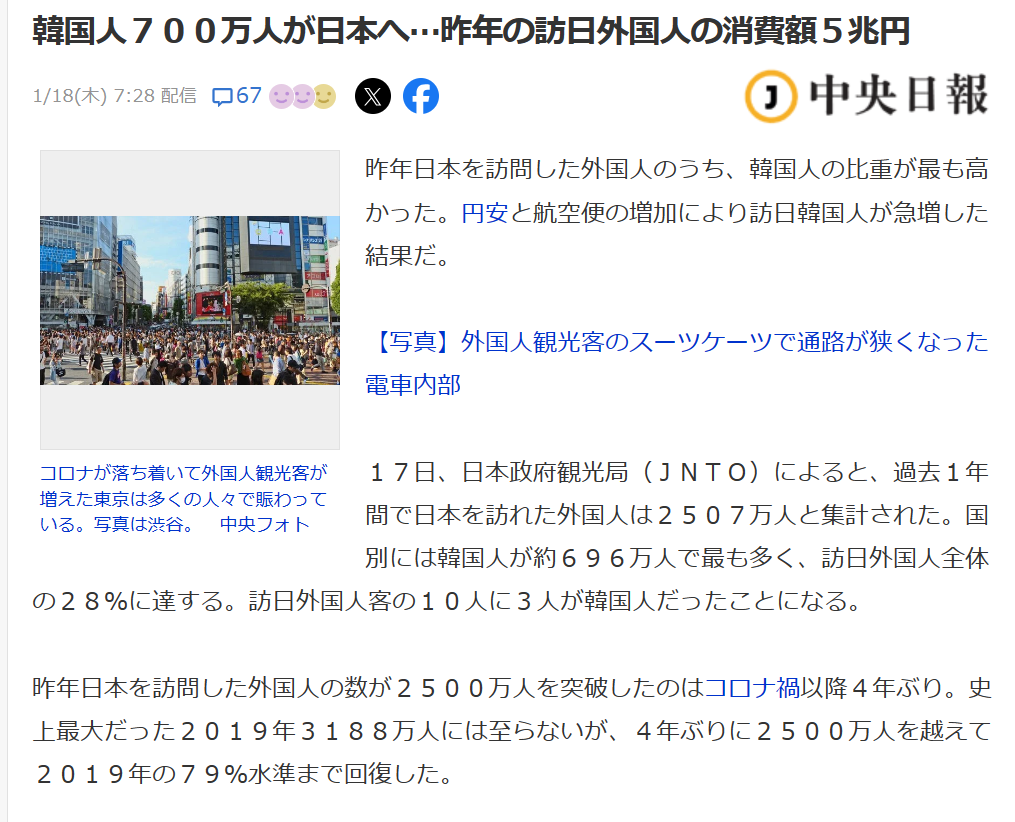 日本を訪れた2500万人のうち韓国人訪問客が700万人に迫り、日本で6兆7000億ウォンを使ったと集計されました。