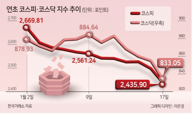 1月、国内証券市場が混沌の時期を送っている。 去る2日から17日までただ一日を除いて毎日株価指数が落ちている状況だ。 年が変わると投資家たちの楽観偏向が発生し、他の月に比べて株価上昇率が高く現れるという「1月効果」はこんにちは「1月悪夢」で投資家たちは苦心は深まっている。 今年に入ってコスピの株価上昇率は主要20カ国(G20)証券市場のうち、最下位を記録中だ。