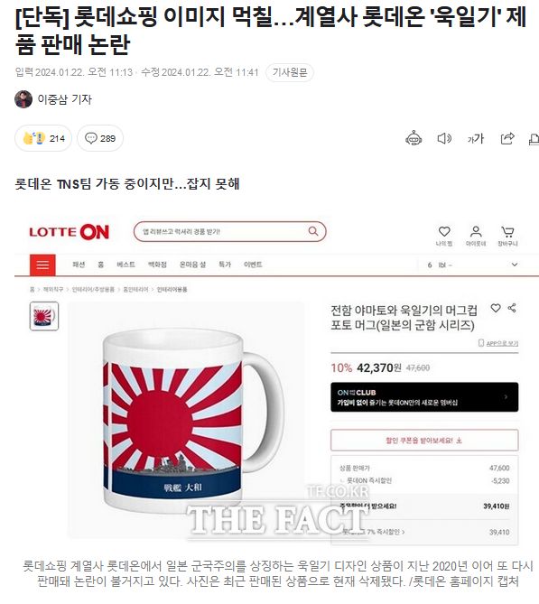 22日、「ザ·ファクト」の取材結果、ロッテオンは同日午前9時40分頃まで旭日旗が描かれたマグカップを販売していた。 海外直購商品で、商品名にも「旭日旗」と表記されていた。 しかし、取材が始まって間もなく、商品販売中断措置が行われた。