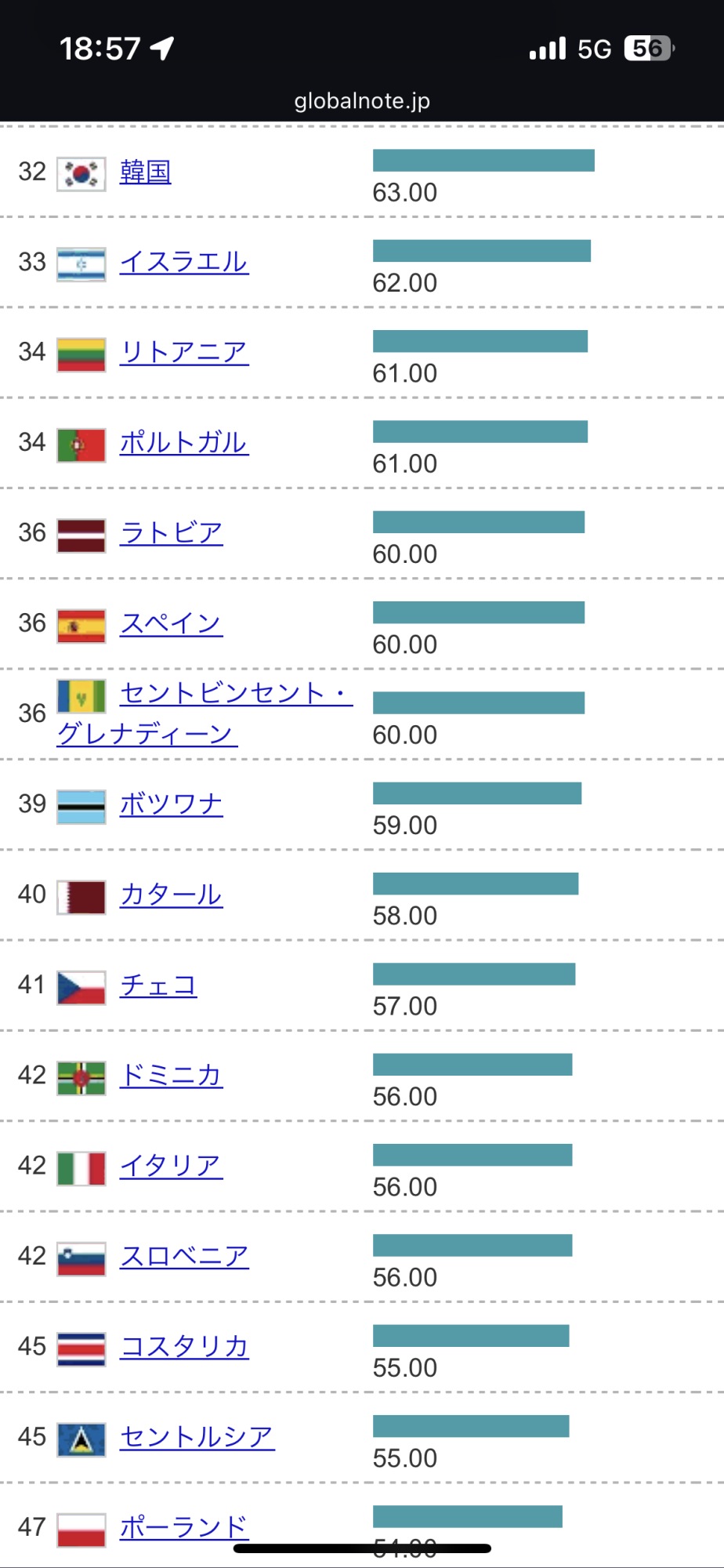 32位(63点)を占めた韓国は、2016年52位(53点)となって以来、2022年31位(63点)まで6年連続で順位が上昇したが、昨年一段階下落した。OECD38カ国の中では22位で、昨年と同じだった。