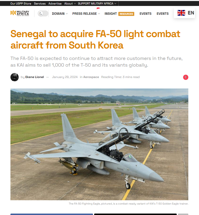 https://www.military.africa/2024/01/senegal-to-acquire-fa-50-light-combat-aircraft-from-south-korea/