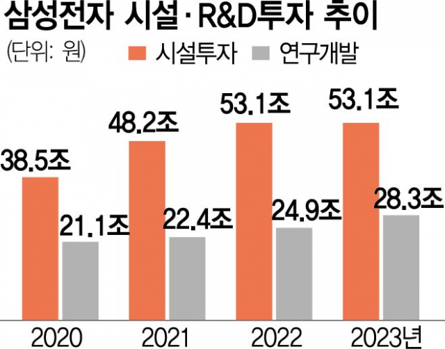 同社は昨年、業績が悪化したにもかかわらず研究開発(R&D)に過去最高の28兆3400億ウォンを投資し、設備投資にも過去最高だった22年と同額の53兆1000億ウォンを投じた。>>45