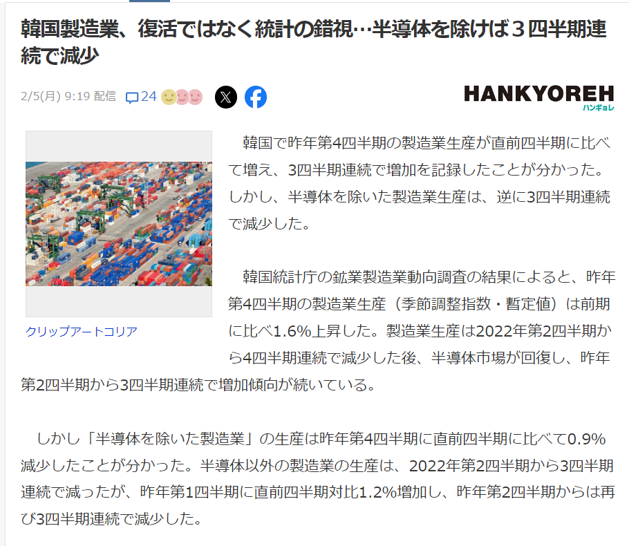 しかし「半導体を除いた製造業」の生産は昨年第4四半期に直前四半期に比べて0.9%減少したことが分かった。半導体以外の製造業の生産は、2022年第2四半期から3四半期連続で減ったが、昨年第1四半期に直前四半期対比1.2%増加し、昨年第2四半期からは再び3四半期連続で減少した。