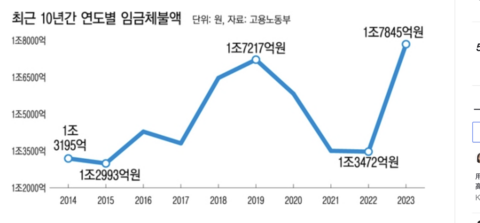 労働部によると、昨年の賃金滞納額は1兆7千845億ウォンで、前年度より32.5%急増した歴代最大金額だ。被害労働者は27万5千432人だった。