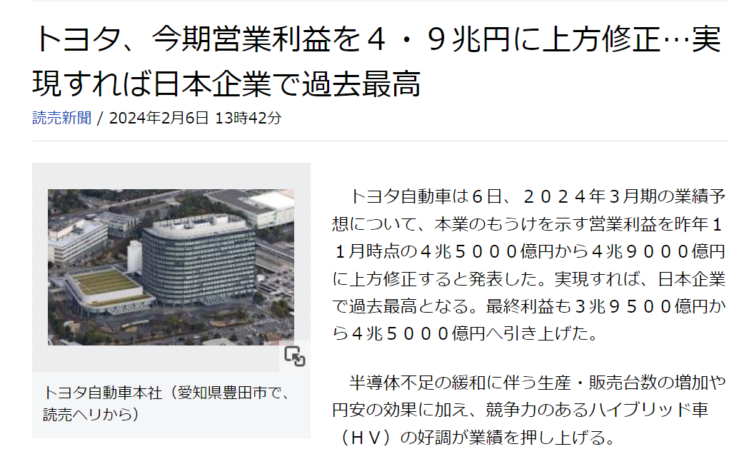 トヨタ、今期営業利益を4・9兆円に上方修正…実現すれば日本企業で過去最高