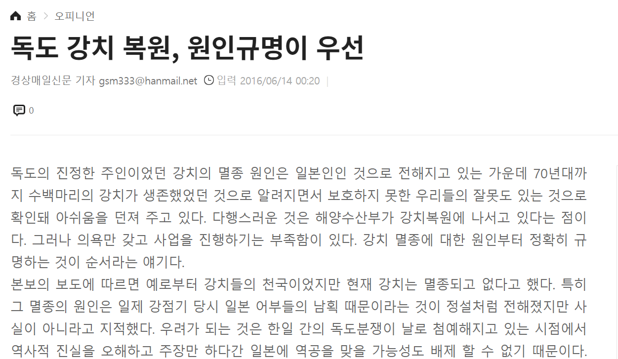 独島のアシカは東海(トンへ、日本名・日本海)沿岸で繁殖した唯一のアシカ科動物だ。日帝の乱獲で絶滅したと伝えられている。日帝は1905年に独島を自国領土に編入した後、アシカ猟を専門とする会社を作って残忍な方法で捕獲した。だが、日本は自国漁民が独島でアシカ猟をしてきた点を独島領有権を主張する根拠の一つとして前面に出している。