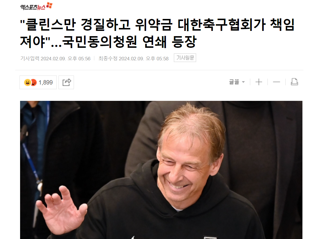 国会国民同意請願サイトによれば、あるサッカーファンが作成した「歴代級黄金世代で構成された大韓民国サッカー国家代表チームを『ポン』サッカー、『してくれ』サッカー、『傍観』サッカーでアジアを驚かせたクリンスマン監督の更迭に関する請願」という題名の請願書が9日公開された。