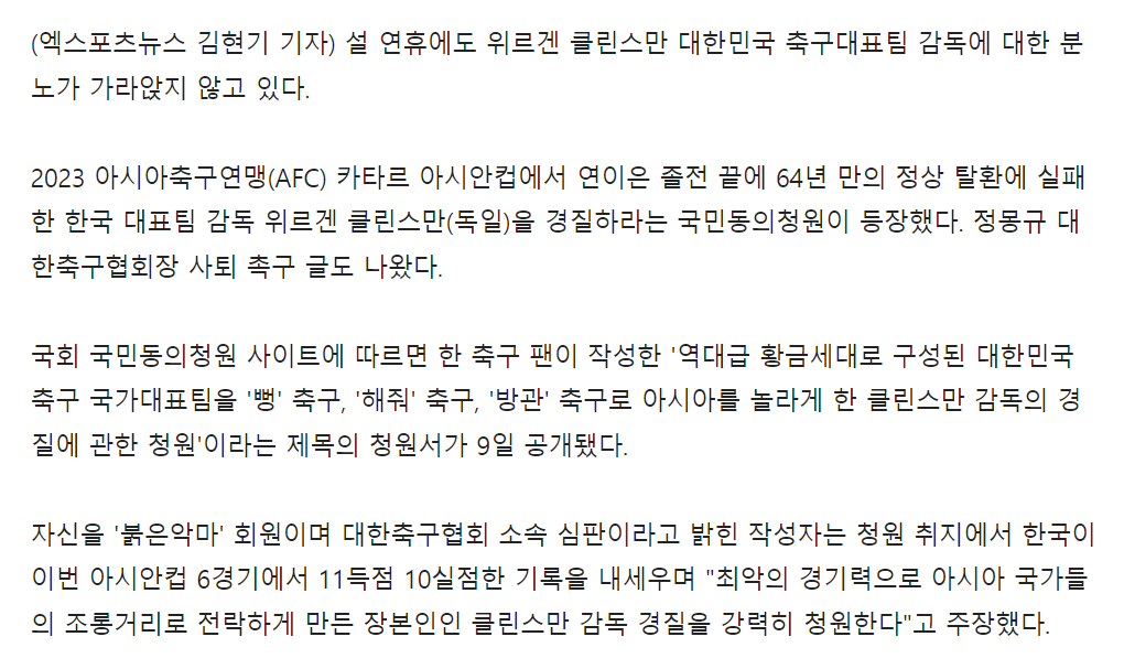 2023アジアサッカー連盟(AFC)カタール·アジアカップで相次ぐ拙戦の末、64年ぶりの首位奪還に失敗した韓国代表監督のユルゲン·クリンスマン(ドイツ)を更迭するよう国民同意請願が登場した。 鄭夢奎(チョン·モンギュ)大韓サッカー協会長の辞任を促す書き込みもあった。