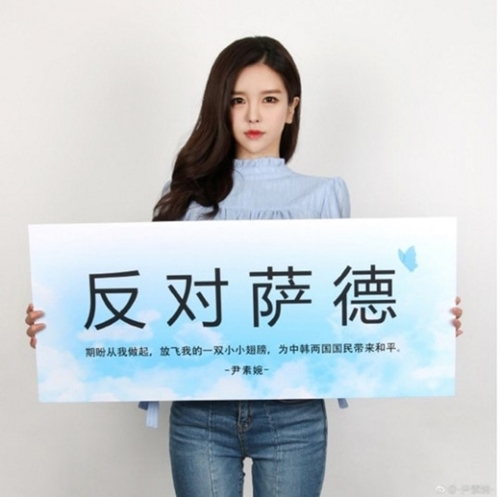 最近、「THAAD報復」と「韓限令」で韓国と中国の関係が薄氷の上を歩いている。その中で13日、インターネット放送BJユン・ソウォンさんは中国のSNSである微博にTHAADに反対するという内容の立て札を手にして撮った写真を載せた。