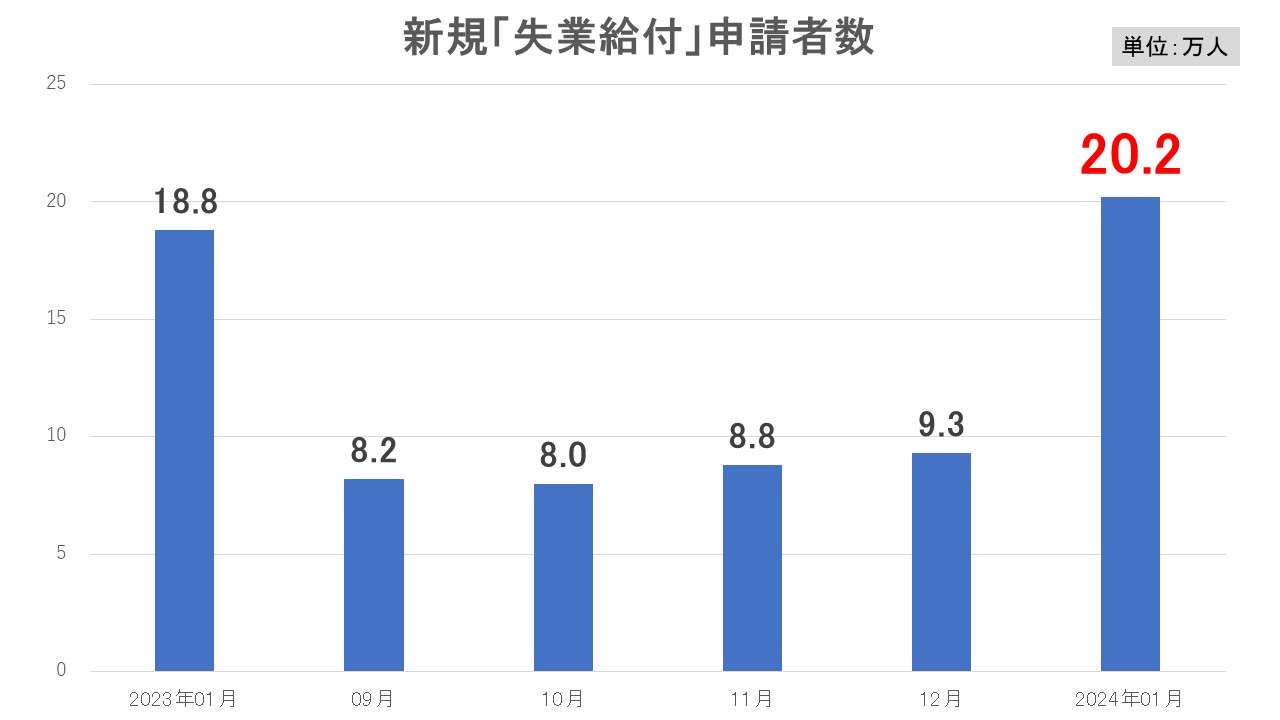 2023年12月には、新規の申請者は9.3万人だったのですが、これが2024年01月には約2.2倍となる「20.2万人」に増加しました。