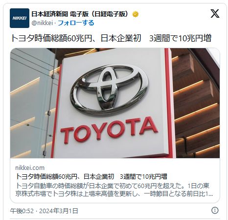 1日の東京株式市場で、トヨタ自動車の時価総額が終値で60兆391億円に拡大した。60兆円を超えるのは日本企業で初めて。同社株の時価総額は2月6日に50兆円を突破しており、1カ月足らずで約10兆円増加した格好だ。