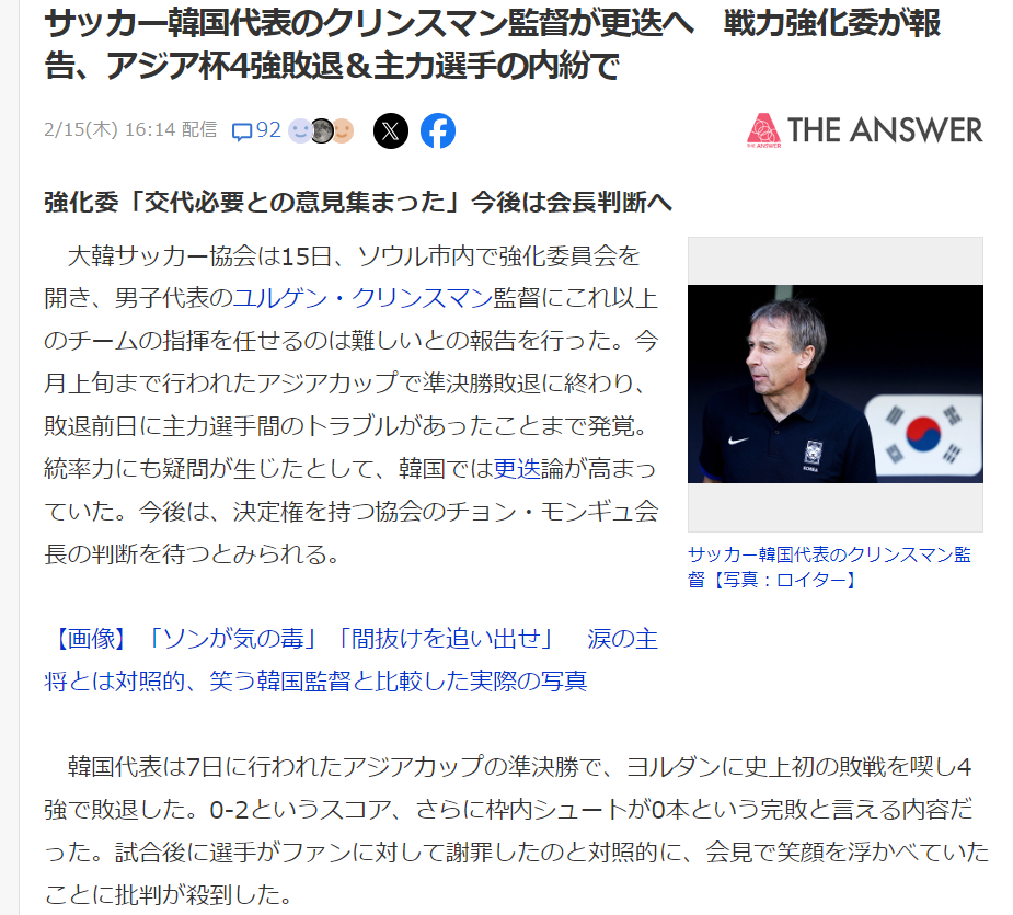 大韓サッカー協会は15日、ソウル市内で強化委員会を開き、男子代表のユルゲン・クリンスマン監督にこれ以上のチームの指揮を任せるのは難しいとの報告を行った。今月上旬まで行われたアジアカップで準決勝敗退に終わり、敗退前日に主力選手間のトラブルがあったことまで発覚。統率力にも疑問が生じたとして、韓国では更迭論が高まっていた。今後は、決定権を持つ協会のチョン・モンギュ会長の判断を待つとみられる。