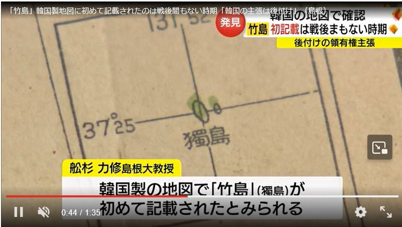 舩杉教授によると、これ以前に竹島が記載された韓国側の地図はないということで、韓国側の領有権主張は、事実上、日本より後であることを裏付ける資料になるとしています。