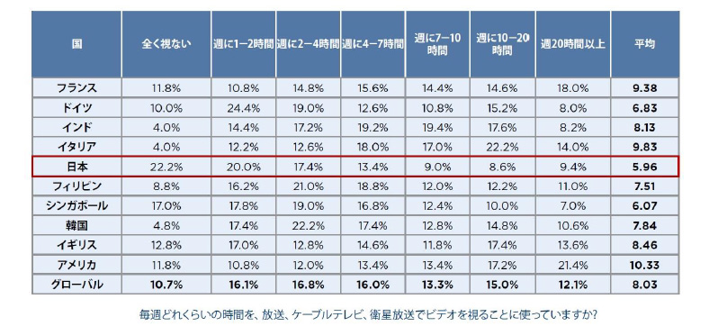 2018年の資料で申し訳ないが、日本人のテレビ視聴時間は平均で1週間に5.96時間で国際的な平均(8.03時間)より2時間以上短い。