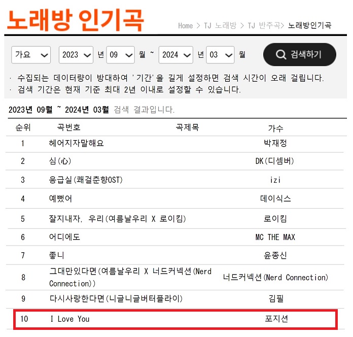 韓国カラオケランキング(TJ)の総合で昨年9月以降現在までの半年余りで10位。あとは中島美嘉の「雪の華」。これもカバー曲が歌われていて、100位以内の下位の方ですが、長くランクインしています。