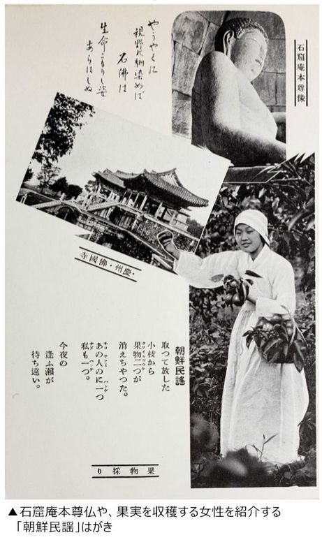 崔教授は「これまで収集したはがきは800枚くらいになる」と語った。そのうちおよそ100枚を著書に収録した。「朝鮮的なもの」のイメージに歌詞を添えて紹介する形式が多い。例えば「朝鮮民謡」はがきには石窟庵本尊仏、リンゴを収穫する朝鮮女性の写真と共に、いとしい人を待つ女性の心を歌った歌詞が登場する。「日帝は、崩壊していた石窟庵を再建して観光地とし、本尊仏の美を女性の体になぞらえました。こういう事情を考慮すると、はがきは受動的・女性的存在である朝鮮と、それを見つめる支配的・男性的な日本の視線をあらわにしていると言えます。民謡となっていますが、歌詞も、詩人・金素雲(キム・ソウン)が当時出版した民謡集には出ておらず、日本人が創作した可能性があります」