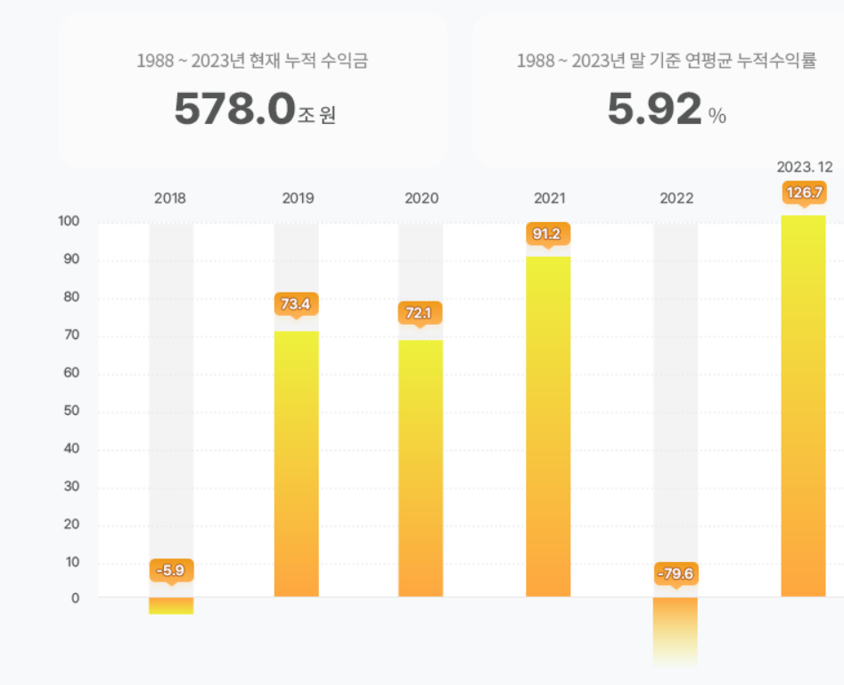 2023年の基金運用収益率は13.59%(金融部門収益率は14.14%)で、基金運用本部設立('99年)以来最も高い収益率を記録したと集計された。 資産別では、国内株式22.12%、海外株式23.89%、国内債券7.4%、海外債券8.84%、代替投資5.8%で、国内外株式の高い収益率が基金運用成果を牽引した。